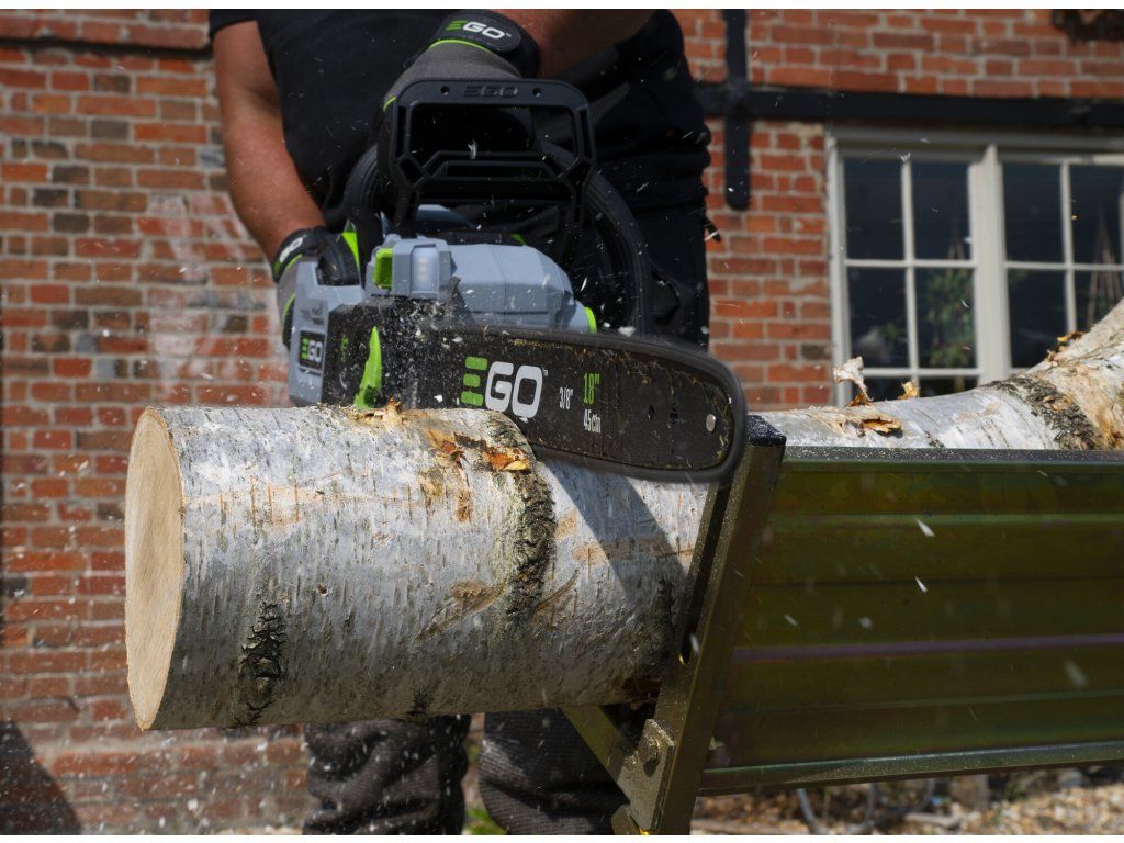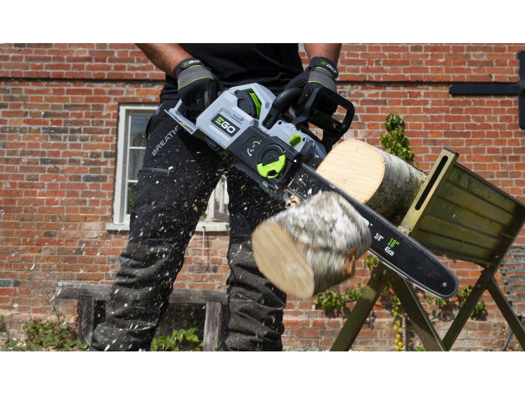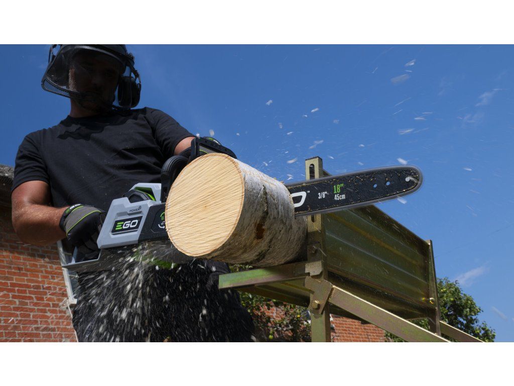 Ve srovnání se svojí předchůdkyní o necelý kilogram zhubla, změnila se celková koncepce rámu pily a umístění baterie. Pro lehkou a přesnou práci a manipulaci je tak celá pila dokonale ergonomicky vyvážena. Lišta v celkové délce 45cm s řeznou rychlostí 22,0m/s poskytuje pile mimořádnou schopnost si poradit i s rozměrnějším kmenem a patří tak k nejvýkonnějším hobby AKU řetězovým pilám na trhu. Řezná rychlost se dá zvolit ve 2 režimech, tzn. ECO a MAX. V případě řezání menších a měkkých dřevin lze zvolit režim ECO, ve kterém se sníží výkon pily na ekonomickou úroveň a šetří se tak baterie. Madlo držení je opatřeno bezpečnostní pojistkou, která zaručuje v případě uvolnění okamžité vypnutí stroje. Na rukojeti je umístněn vypínač, který zajišťuje při stisknutí plynulé a postupné spuštění stroje. Nad rukojetí s vypínačem je umístěn panel s dobře čitelným LCD displejem. Na panelu jsou dobře přístupná tlačítka volby řezné rychlosti ECO nebo MAX., zapínání LED světla. Displej zobrazuje kontrolky zvoleného řezného režimu, zapnutého světla a zapnuté brzdy řetězu. Díky příjemné ovládácí rukojeti a umístění baterie je držení pily při práci velmi stabilní, bezpečné a pohodlné a stroj je vhodný pro jakékoliv zahradnické práce v domácím použití. Výkonné LED světlo vám dokonale osvětlí pracovní prostor. Ideální pro tesaře na konstrukci krovů k osvětlení pracovního prostoru při přesné práci za snížené viditelnosti na stavbách. Mazání řetězu je zde plně automatické a díky spolehlivému olejovému čerpadlu je podáváno příslušné množství mazacího oleje přímo do vodící drážky lišty. Díky konstrukci lišty a posuvu řetězu se dopraví každá kapka mazacího oleje přesně tam kde je to nutné. Pro kontrolu hladiny mazacího oleje je pila opatřena kontrolním olejoznakem. Na pohon pily lze použít jakoukoliv baterii ze sortimentu EGO a např. baterie 2,5Ah vám umožní uskutečnit až 110 řezů a s baterií 5,0Ah až 270 řezů. Naše lithiové baterie EGO Power+ 56V Arc Vám poskytnou dostatek energie pro pohon dostatečně výkonného a účinného bezuhlíkového elektromotoru s přímým náhonem na řetězku. Díky externímu umístění baterie mimo kapotáž pily je baterie efektivněji ochlazována. Pila je mimořádně tichá a sousedé Vás při práci ani neuslyší. Žádná napájecí šňůra, žádné provozní náplně, žádný hluk, žádný zápach. Nízká hmotnost, pohodlný úchop a snadná manipulace dělají z této řetězové pily vynikajícího pracanta nejenom na chalupě, ale i v rukou pracovníka obecní údržby zeleně.
