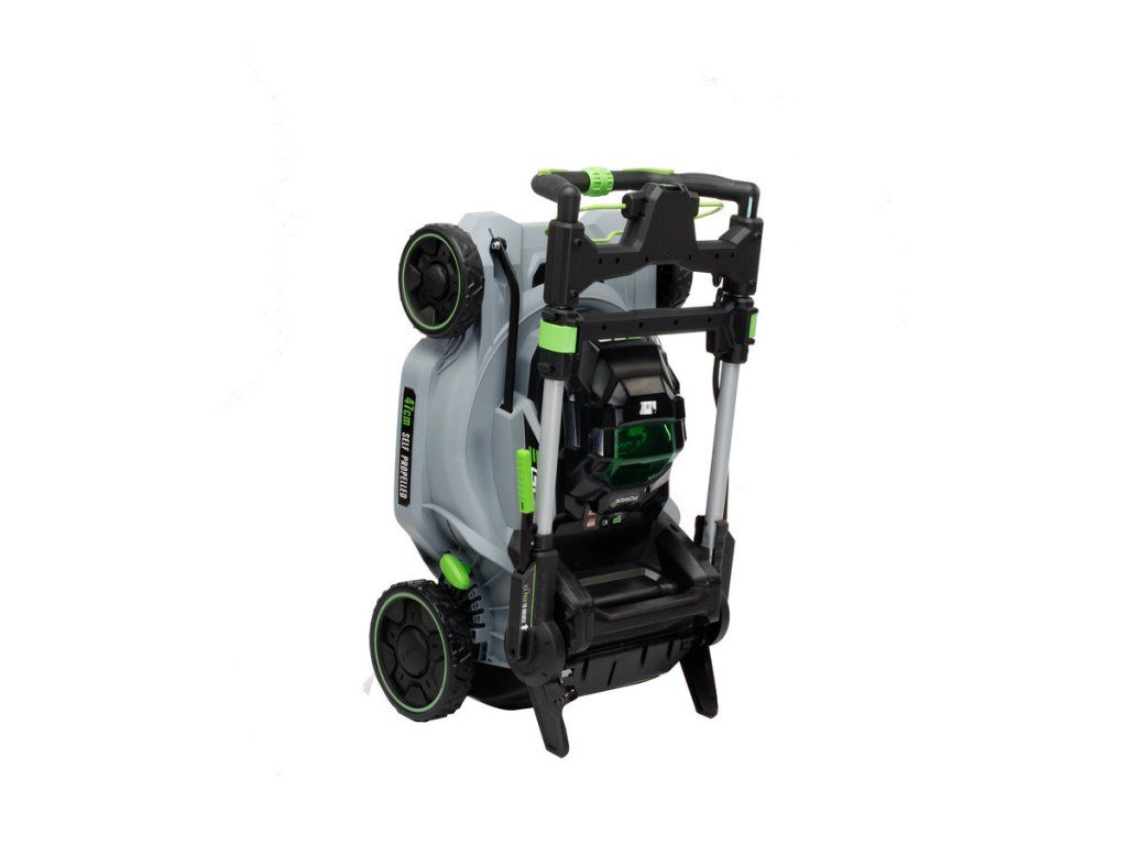 Model EGO LM 1711E - záběr sečení 42cm, bez vlastního pojezdu, volič režimu sekání, objem sběrného koše 55L, teleskopická a výškově nastavitelná komfortní rukojeť.