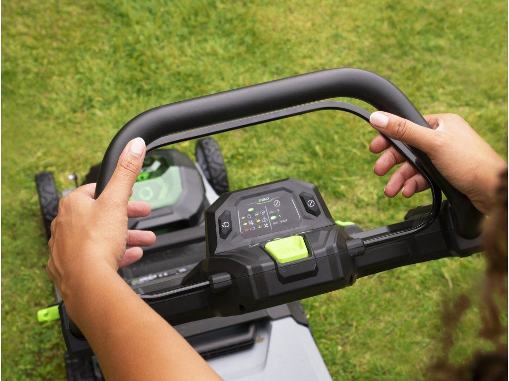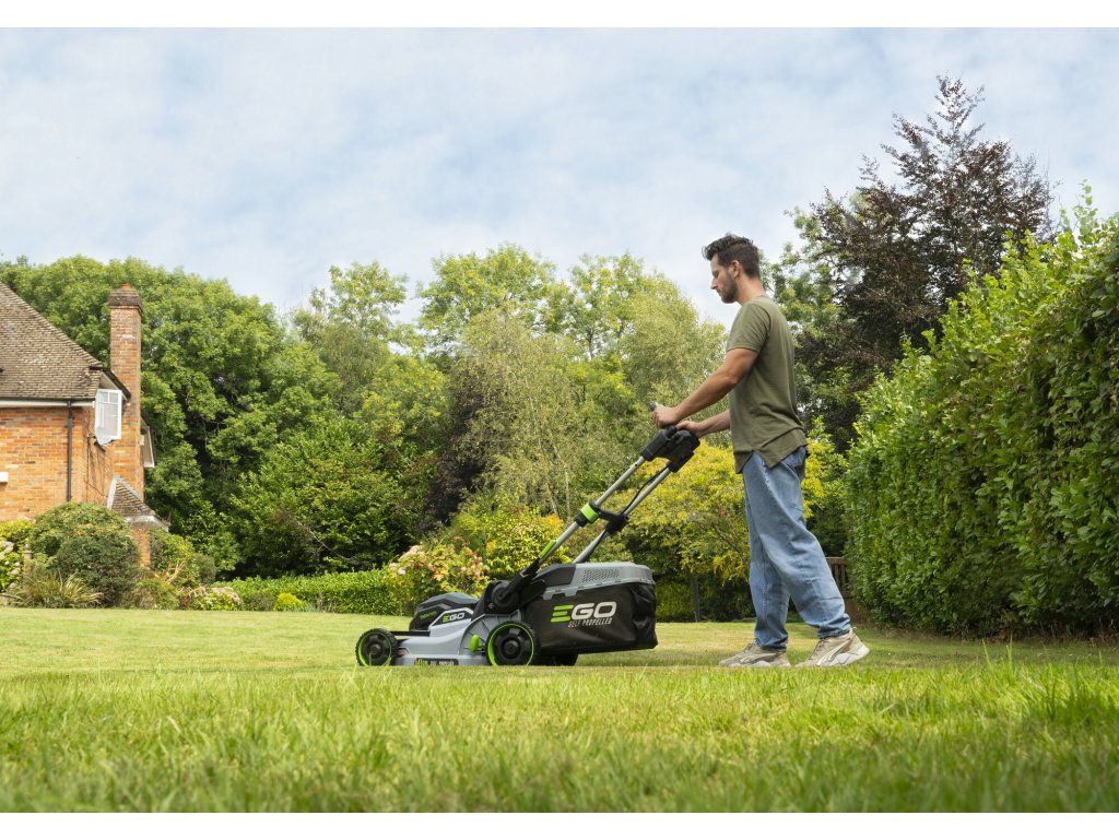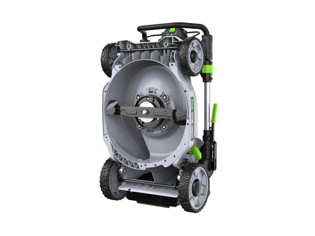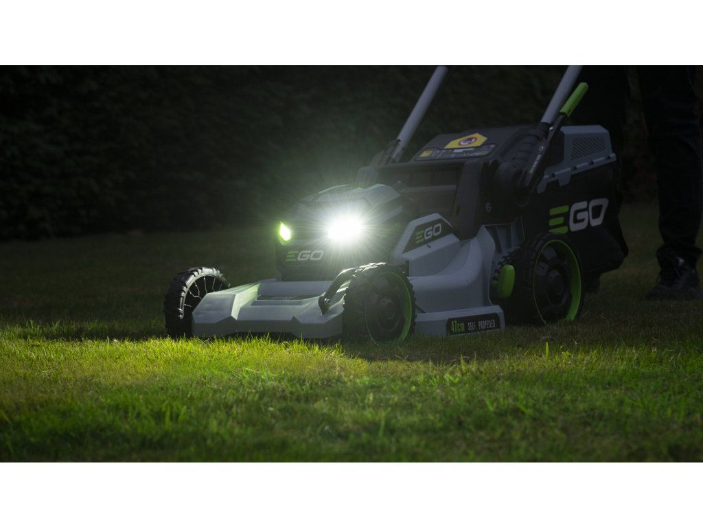 Model EGO LM 1910E - záběr sečení 47cm, bez vlastního pojezdu, volič režimu sekání, objem sběrného koše 55L, teleskopická a výškově nastavitelná komfortní rukojeť.