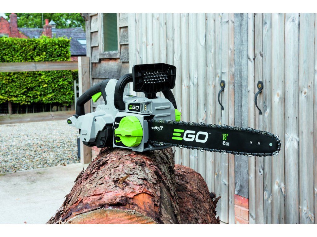 Pro lehkou a přesnou práci a manipulaci je celá pila dokonale ergonomicky vyvážena. Lišta v celkové délce 45cm, popř. 40cm poskytuje pile mimořádnou schopnost si poradit i s rozměrnějším kmenem. Madlo držení je opatřeno bezpečnostní pojistkou, která zaručuje v případě uvolnění okamžité vypnutí stroje. Na rukojeti je umístněn vypínač, který zajišťuje při stisknutí plynulé a postupné spuštění stroje. Díky příjemné ovládácí rukojeti je držení pily při práci velmi stabilní, bezpečné a pohodlné a stroj je vhodný pro jakékoliv zahradnické práce v domácím použití. Výkonné LED světlo vám dokonale osvětlí pracovní prostor. Ideální pro tesaře na konstrukci krovů k osvětlení pracovního prostoru při přesné práci za snížené viditelnosti na stavbách. Díky unikátnímu systému automatického napínání řetězu ("Auto Chain Tensioning") jsou odstraněny veškeré dohady a pochybnosti o správnosti napnutí řetězu. Při výměně nebo nutnosti napnutí řetězu prostě na pile jen mírně povolíte víko řetězky a opět znovu dotáhnete. Pružina automaticky řetěz napne a můžete okamžitě pokračovat v řezání. Tento prvek ocení zejména tesaři při balancování mnohdy ve výšce konstrukce krovu. Mazání řetězu je zde plně automatické a díky spolehlivému olejovému čerpadlu je podáváno příslušné množství mazacího oleje přímo do vodící drážky lišty. Díky konstrukci lišty a posuvu řetězu se dopraví každá kapka mazacího oleje přesně tam kde je to nutné. Pro kontrolu hladiny mazacího oleje je pila opatřena kontrolním olejoznakem. Na pohon pily lze použít jakoukoliv baterii ze sortimentu EGO a např. baterie 2,5Ah vám umožní uskutečnit až 130 řezů a s baterií 5,0Ah až 300 řezů. Naše lithiové baterie EGO Power+ 56V Arc Vám poskytnou dostatek energie pro pohon dostatečně výkonného a účinného bezuhlíkového elektromotoru s přímým náhonem na řetězku. Díky externímu umístění baterie mimo kapotáž pily je baterie efektivněji ochlazována a je schopna efektivněji napájet motor pily. Pila je mimořádně tichá a sousedé Vás při práci ani neuslyší. Žádná napájecí šňůra, žádné provozní náplně, žádný hluk, žádný zápach. Nízká hmotnost, pohodlný úchop a snadná manipulace dělají z této řetězové pily vynikajícího pracanta nejenom na chalupě, ale i v rukou profesionála tesaře nebo pracovníka údržby komunální zeleně.