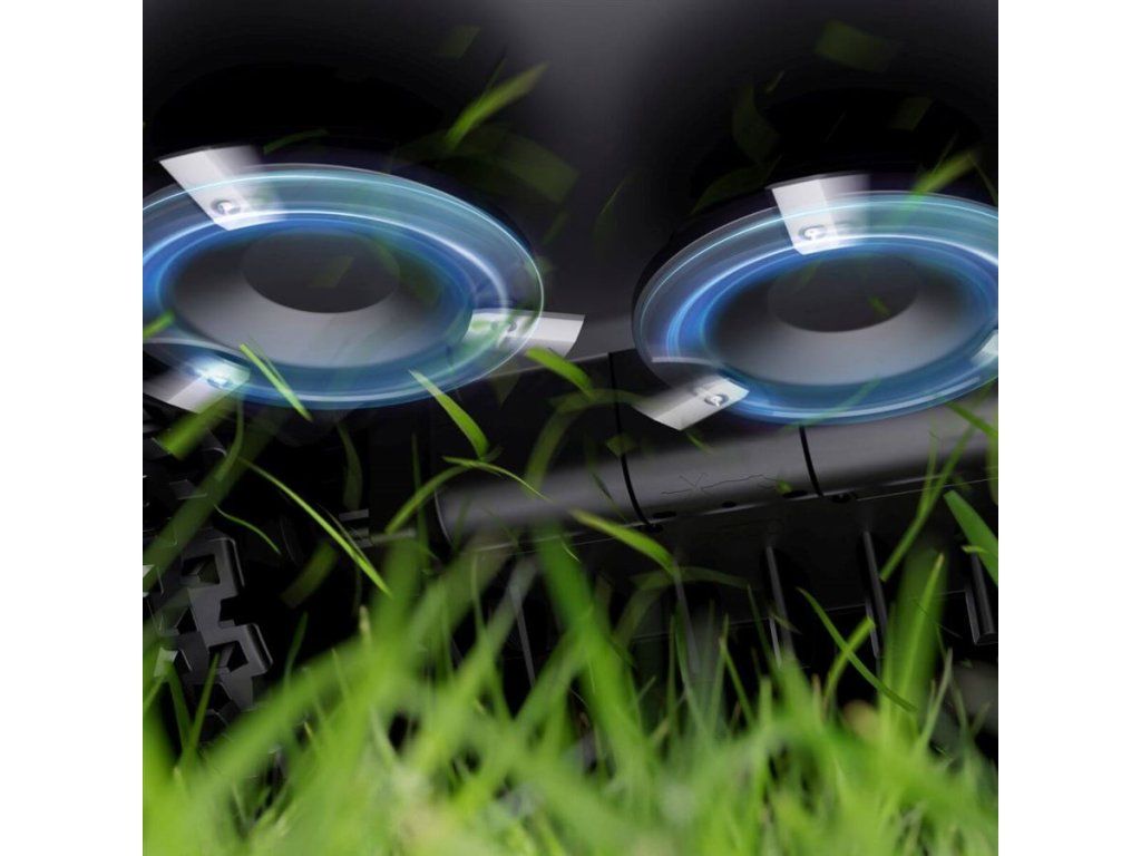 Technologie dvou žacích kotoučů Dual Blade-Disc se šířkou sečení až 33 cm zajišťuje vysokou efektivitu a úsporu času zejména při sečení větších zahrad. Každý ze dvou žacích kotoučů je vybaven třemi žacími noži s konstrukcí bez mezery. Díky tomu mezi žacími kotouči nezůstává ani stéblo neposečené trávy.