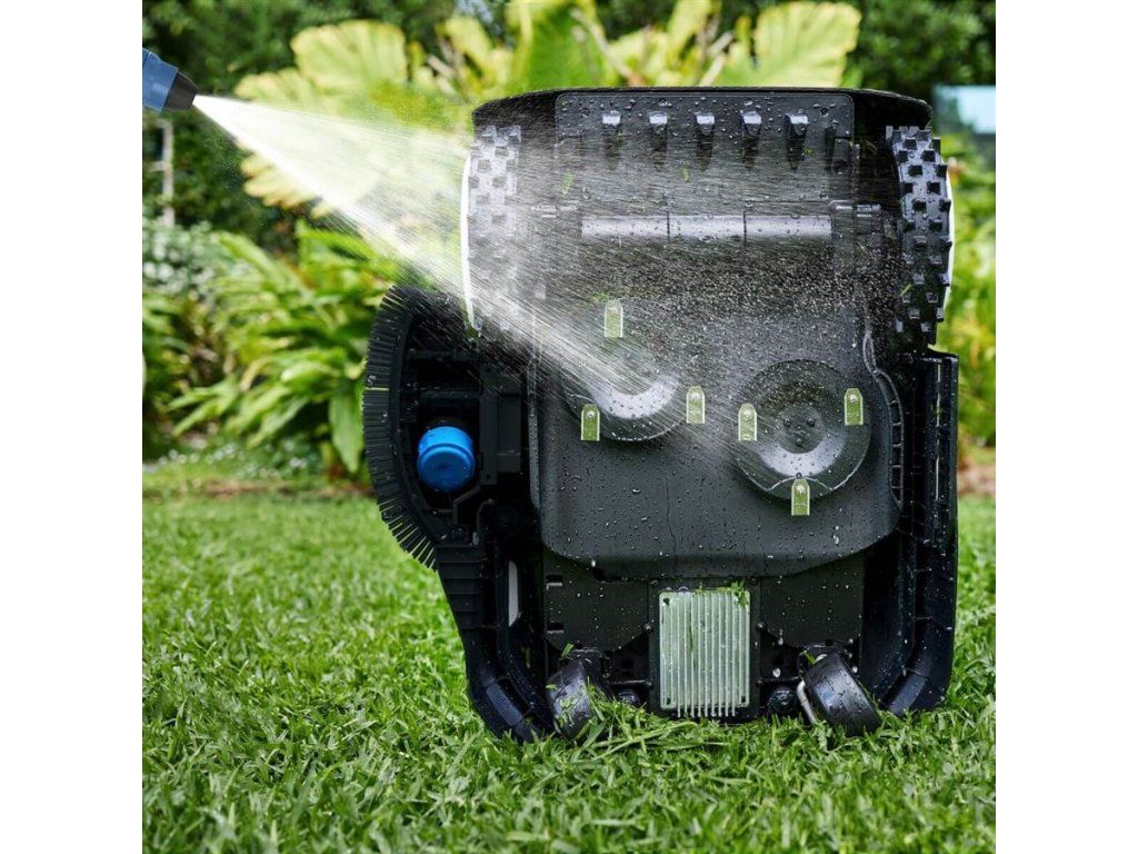 Ani čištění robotické sekačky vám nezabere moc času. Díky vodotěsnosti IPX6 ji stačí převrátit na bok a spodní část a žací kotouč omývat zahradní hadicí. Rovněž omyjete i vnějšek robotické sekačky.