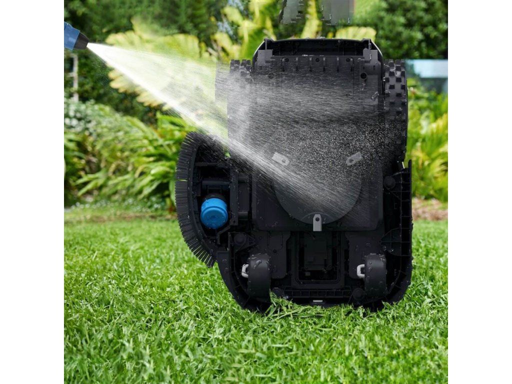 Ani čištění robotické sekačky vám nezabere moc času. Díky vodotěsnosti IPX6 ji stačí převrátit na bok a spodní část a žací kotouč omývat zahradní hadicí. Rovněž omyjete i vnějšek robotické sekačky.